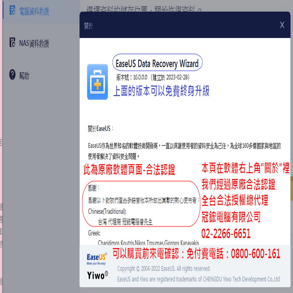 此為易我資料恢復廠軟體認證畫面,在軟體本身就看的到,購買易我資料復原正版資料救援軟體請指定,台灣官方唯一總代理:冠鋐電腦有限公司